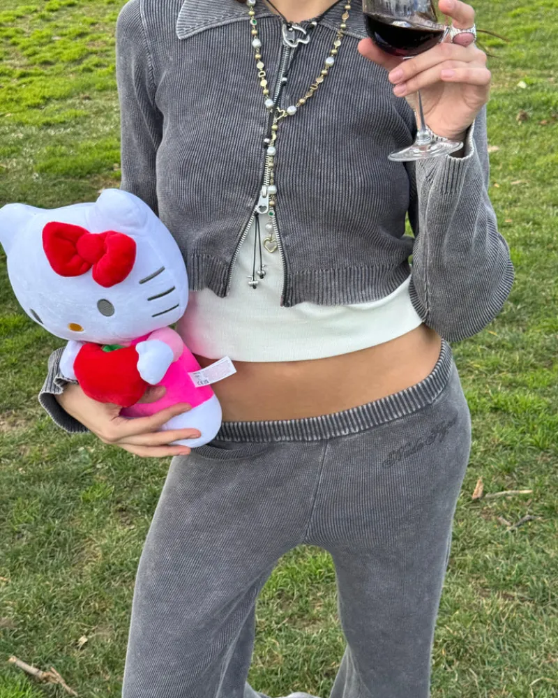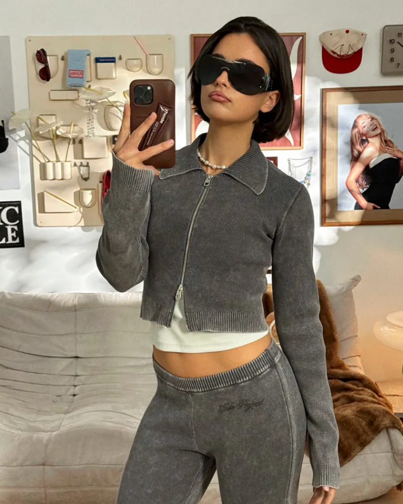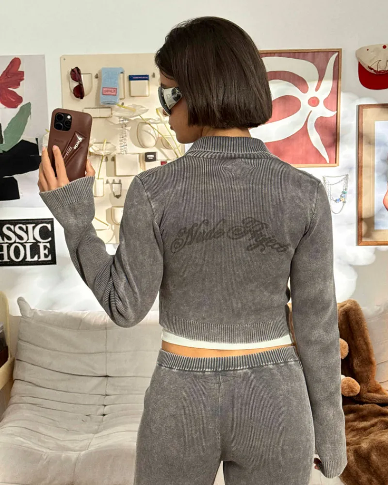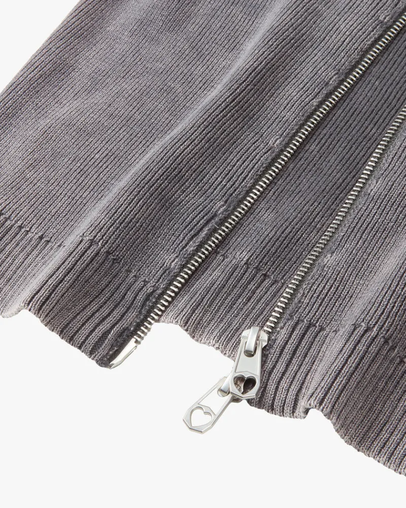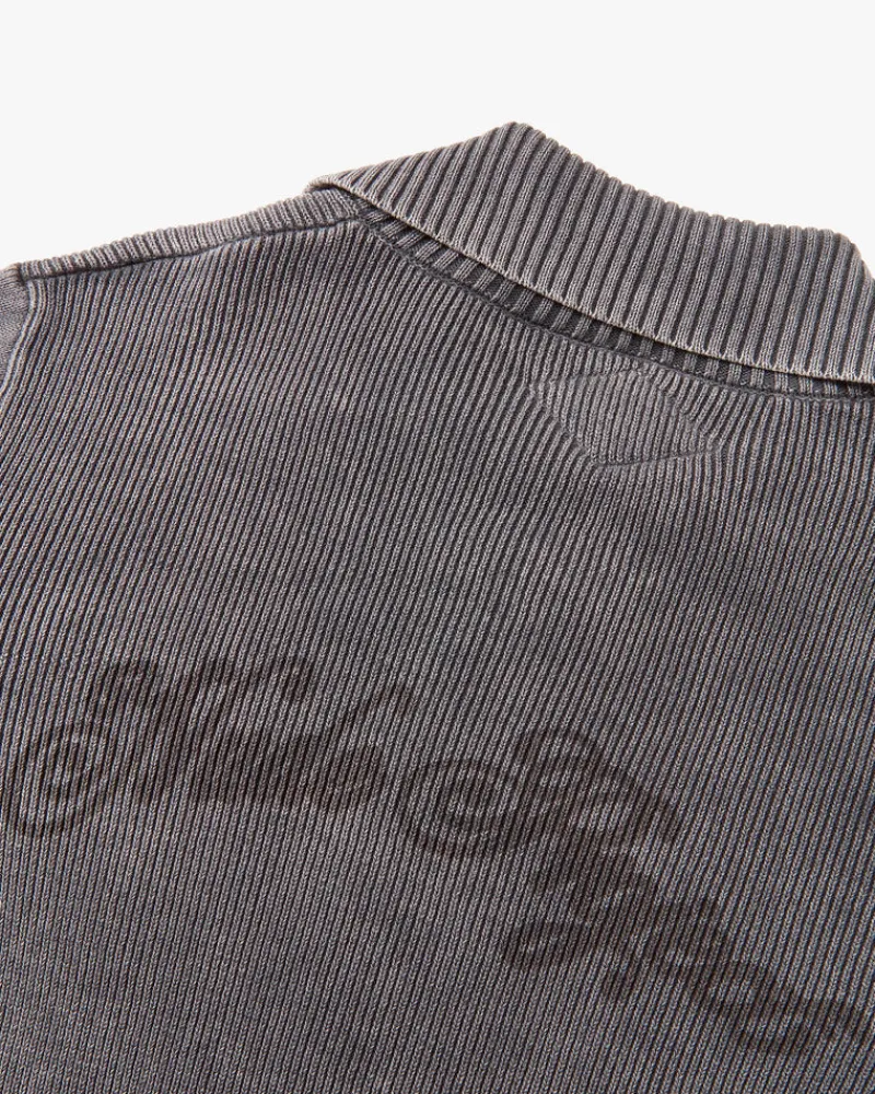 Knitted zipper with collar and custom puller. Yarn dye and hard wash.