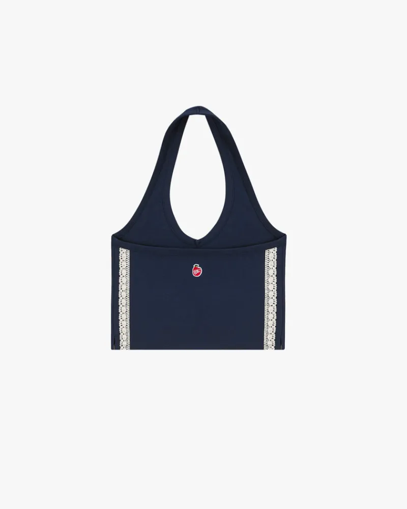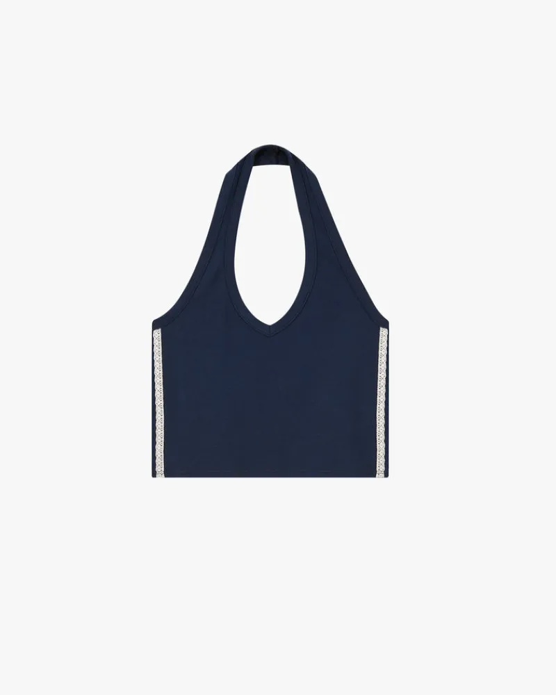 Composition:100% cottonFit:Halter top.Graphic:Decorative label.Technical details:Lace tape of 2 different widths on both…