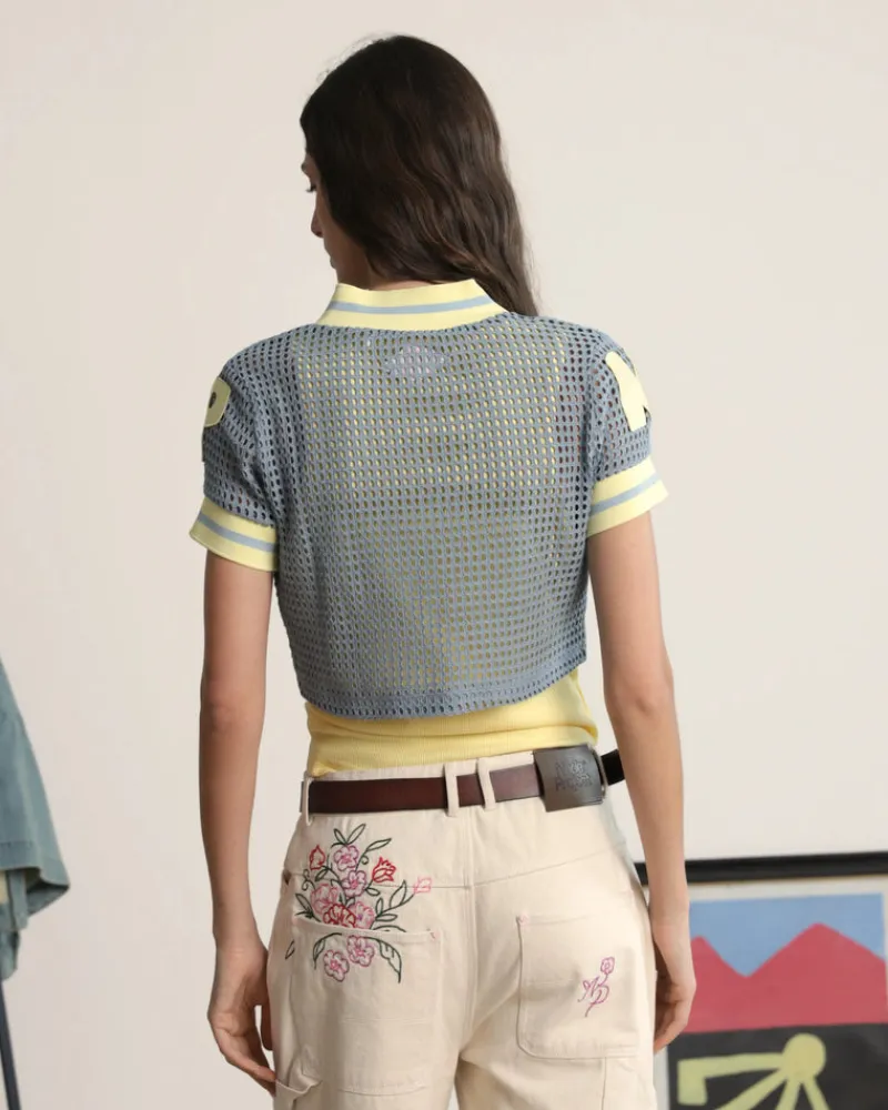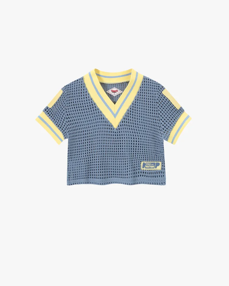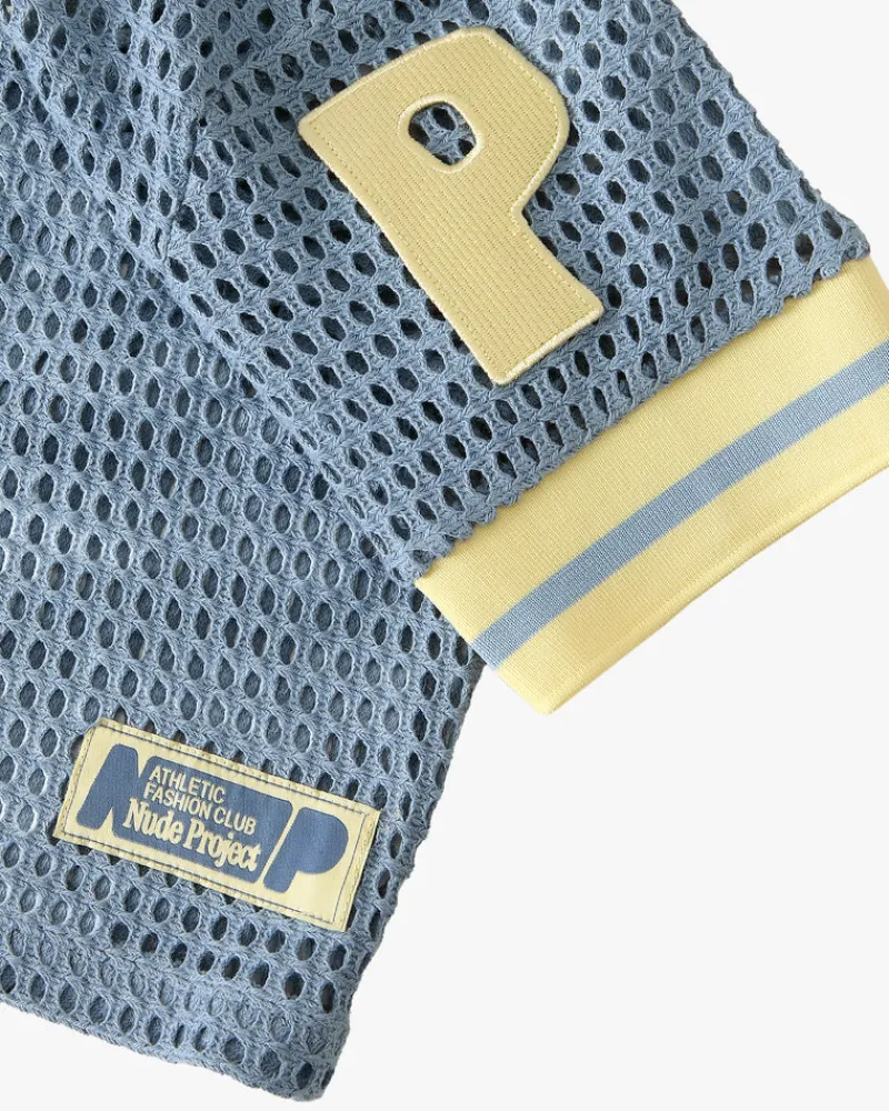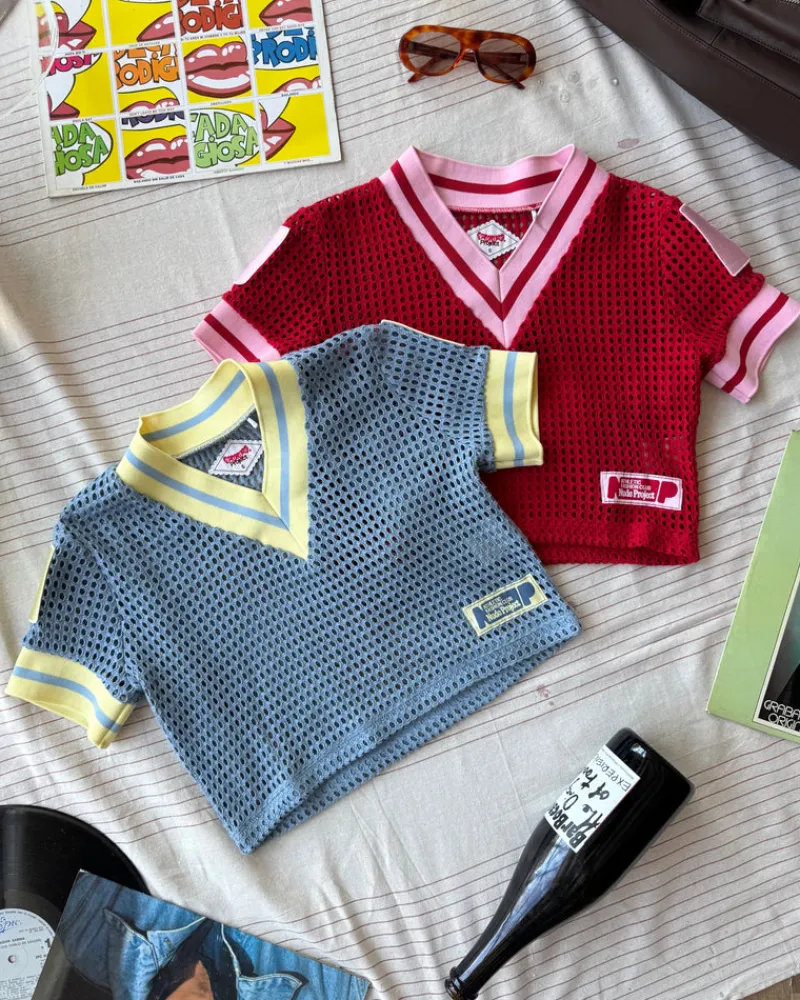 Wide hole mesh fabric. Elastic jacquard rib on neck and sleeves.
