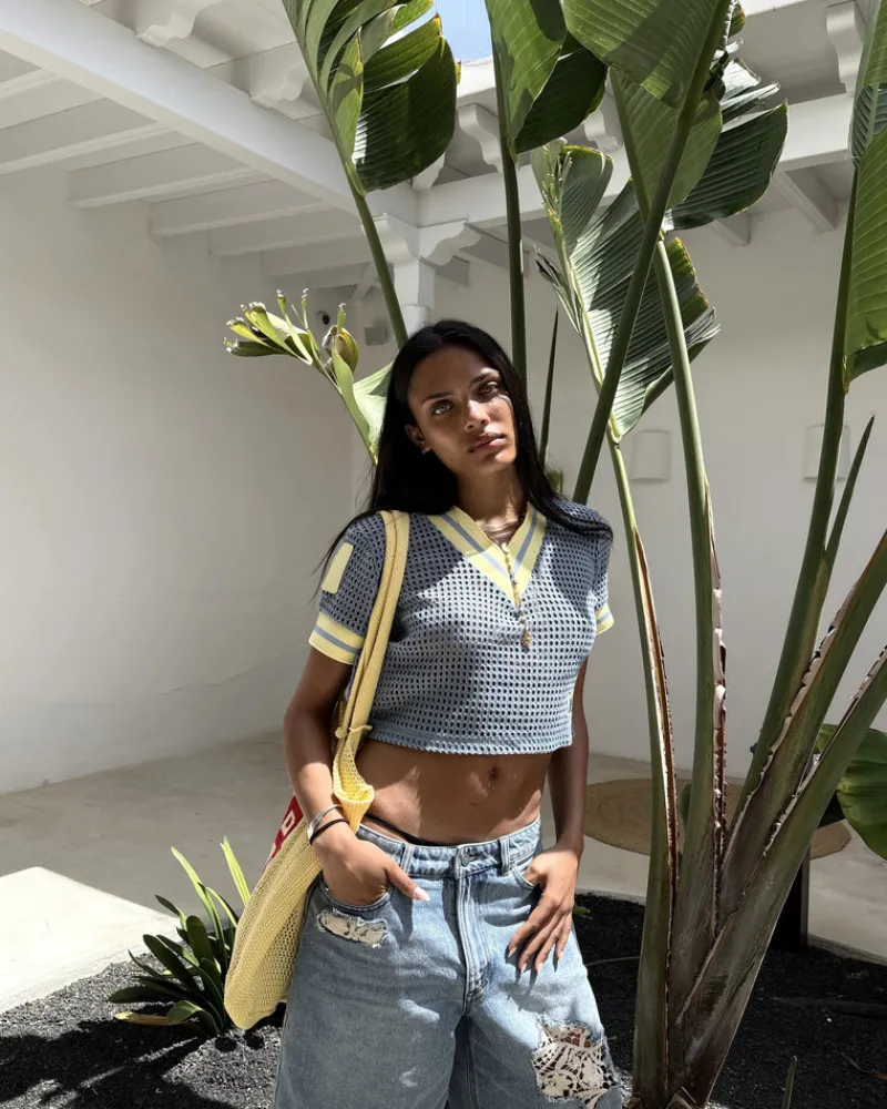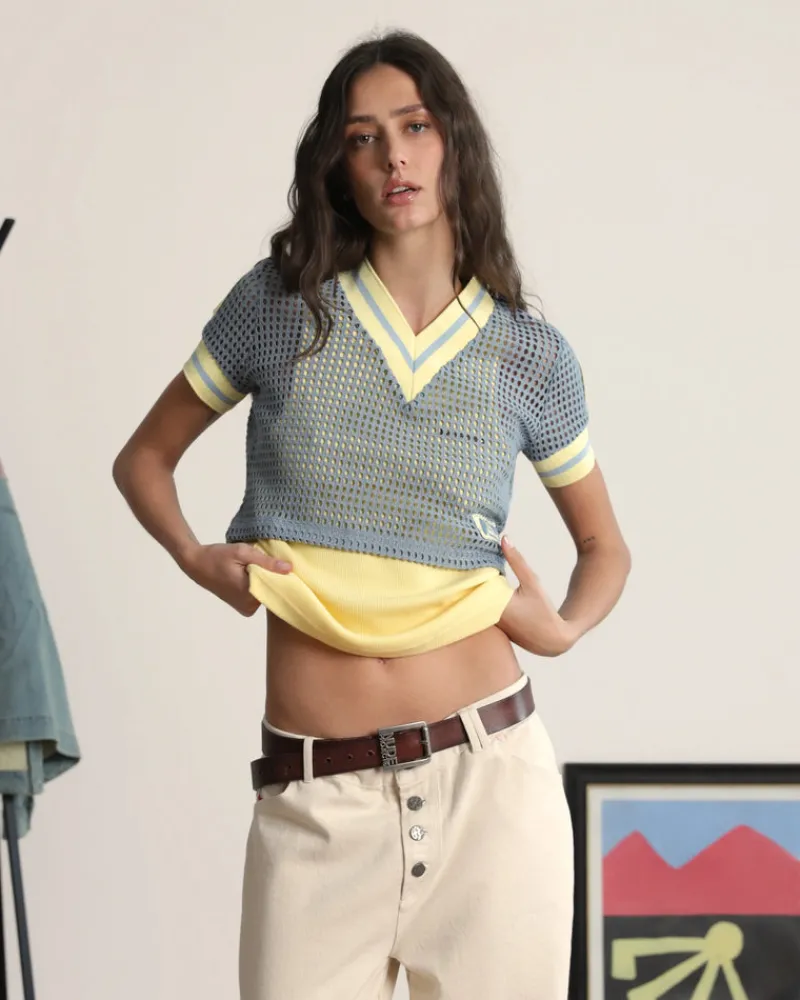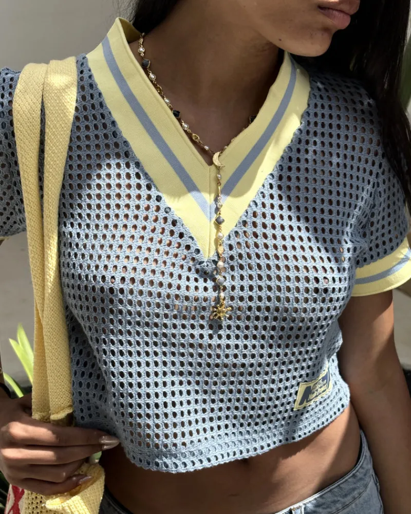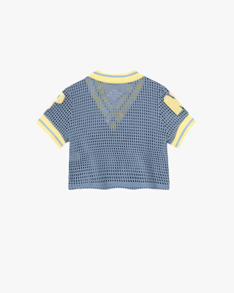 Wide hole mesh fabric. Elastic jacquard rib on neck and sleeves.