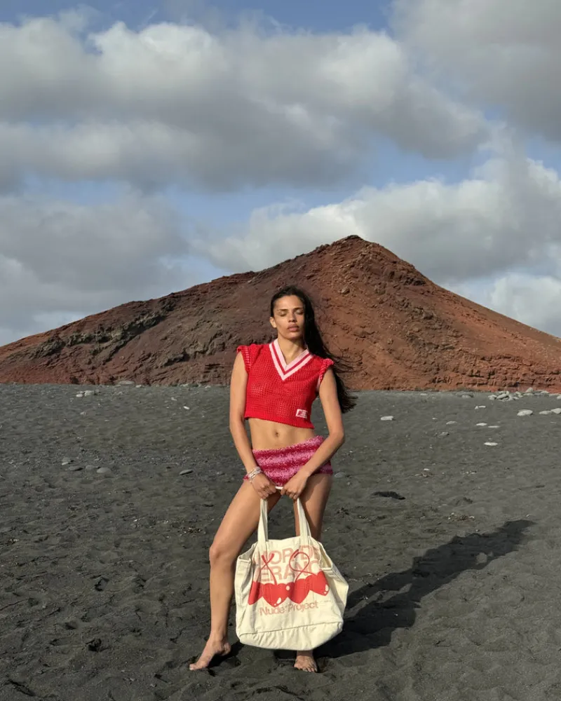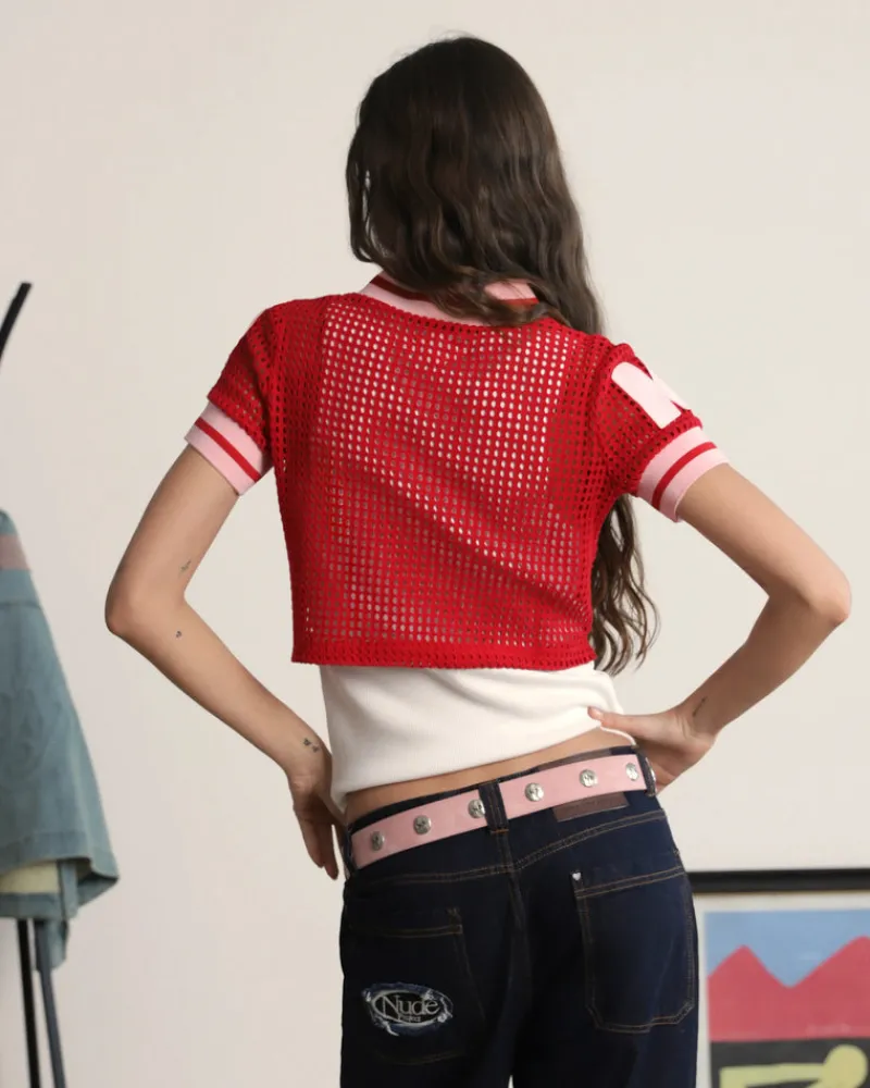 Wide hole mesh fabric. Elastic jacquard rib on neck and sleeves.