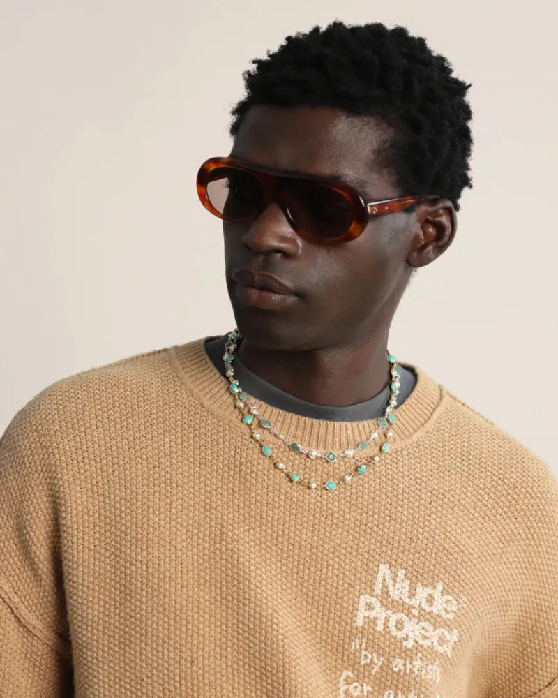 Gold chain featuring pearls and turquoise stones, creating a perfect blend of elegance and vibrant color.