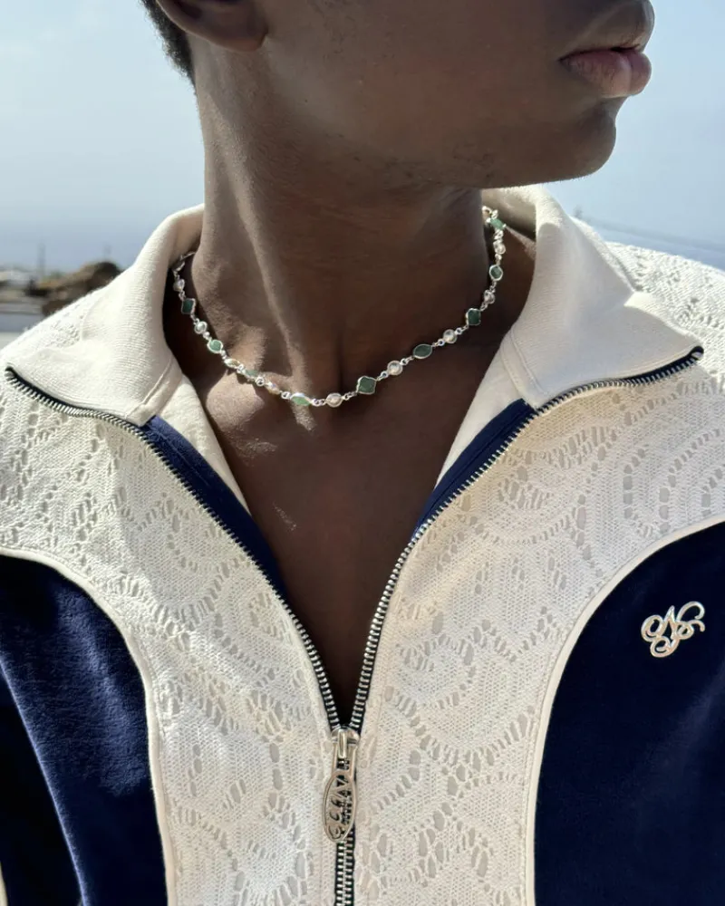 The combination of pearls and green quartz creates a unique, radiant piece that adds a pop of color and a serene vibe to any look.