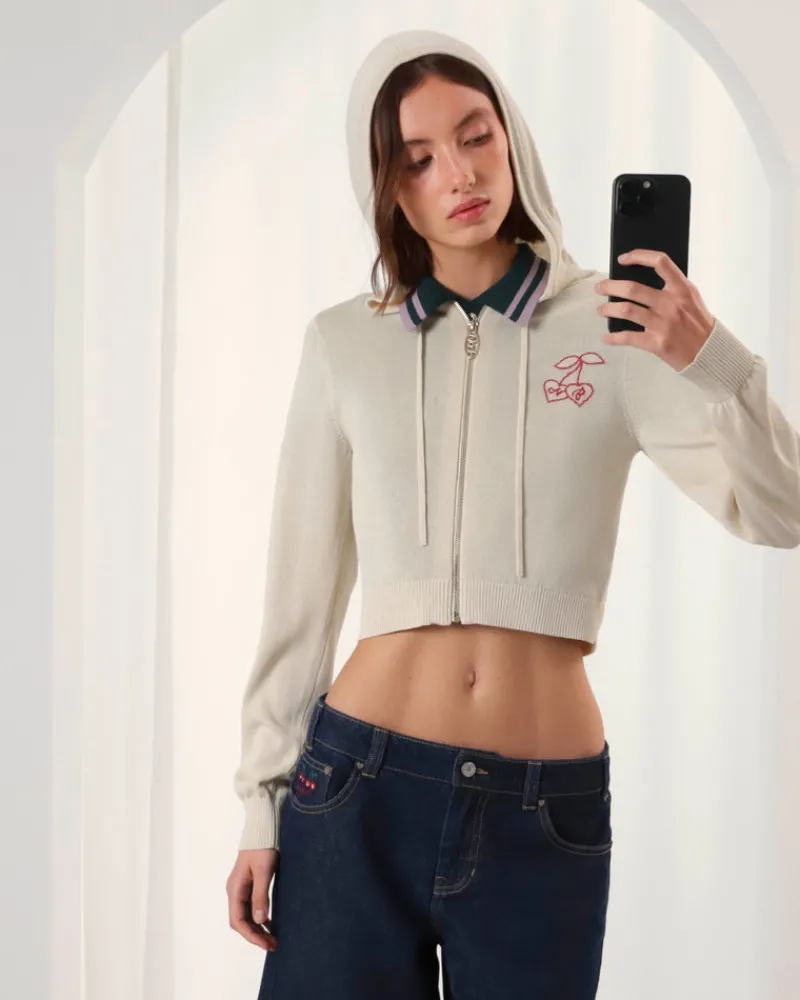 COMPOSITION:89% Viscose, 11% NylonFIT:Cropped hoodieGRAPHIC:Jacquard logo imitating cross stitch. TECHNICAL DETAILS:-