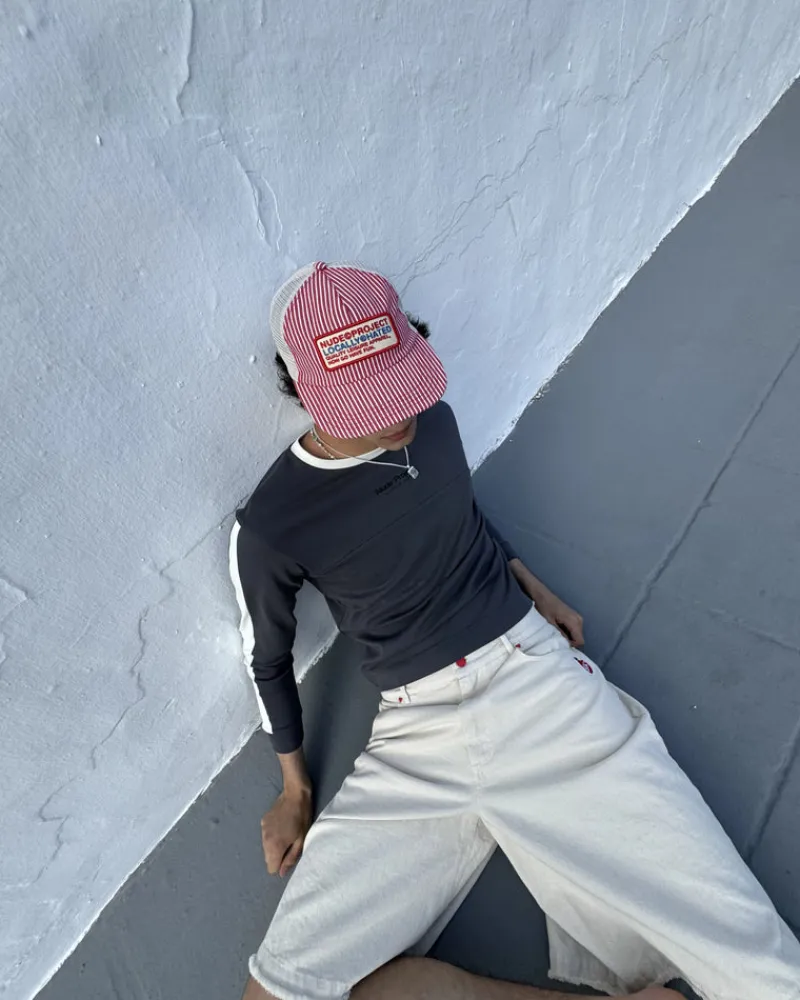 Front panels and visor in 100% cotton striped fabric; breathable mesh back for extra ventilation.