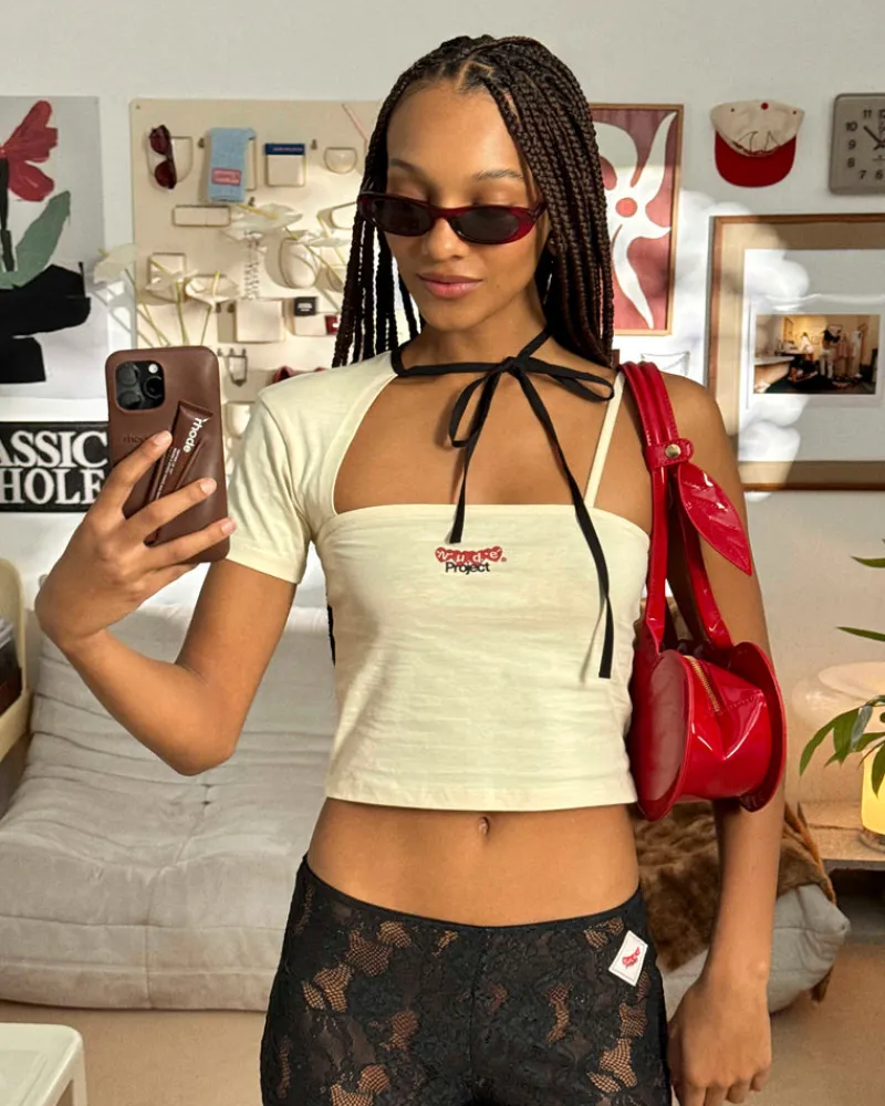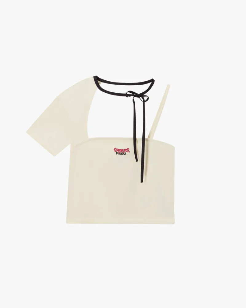 Asymetric short sleeve t-shirt laced on the neck.