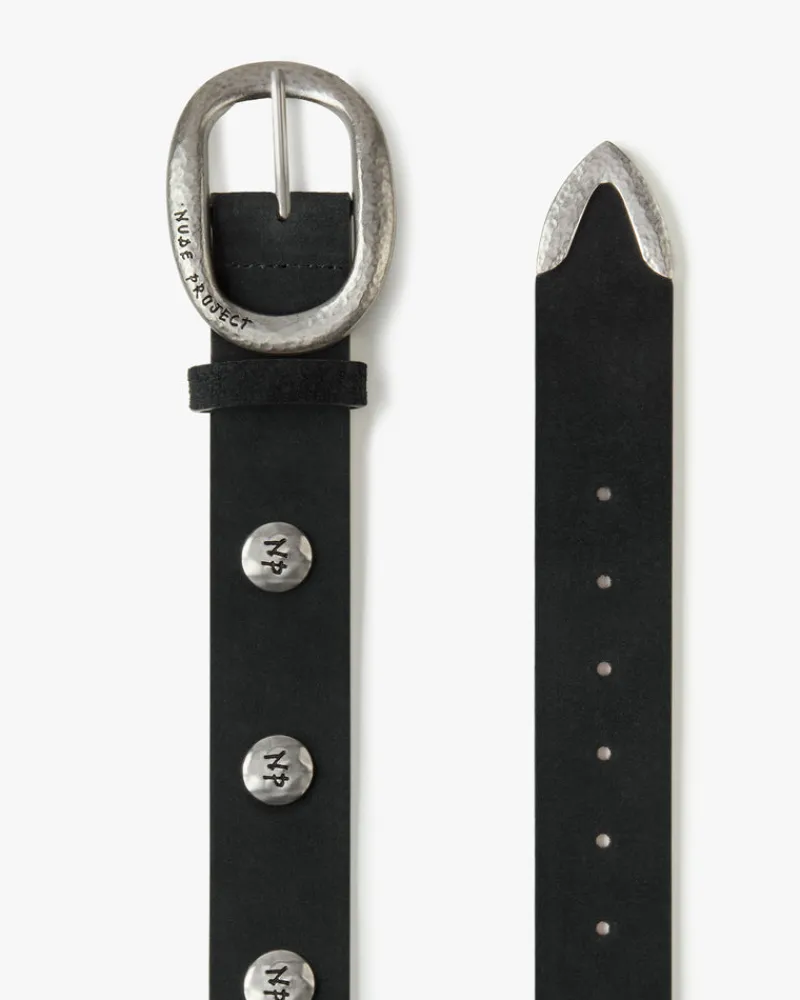 Metal studs with embossed “NP” logo along the strap, adding a bold yet refined detail. The hammered metal buckle enhances the textured aesthetic.
