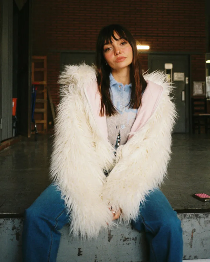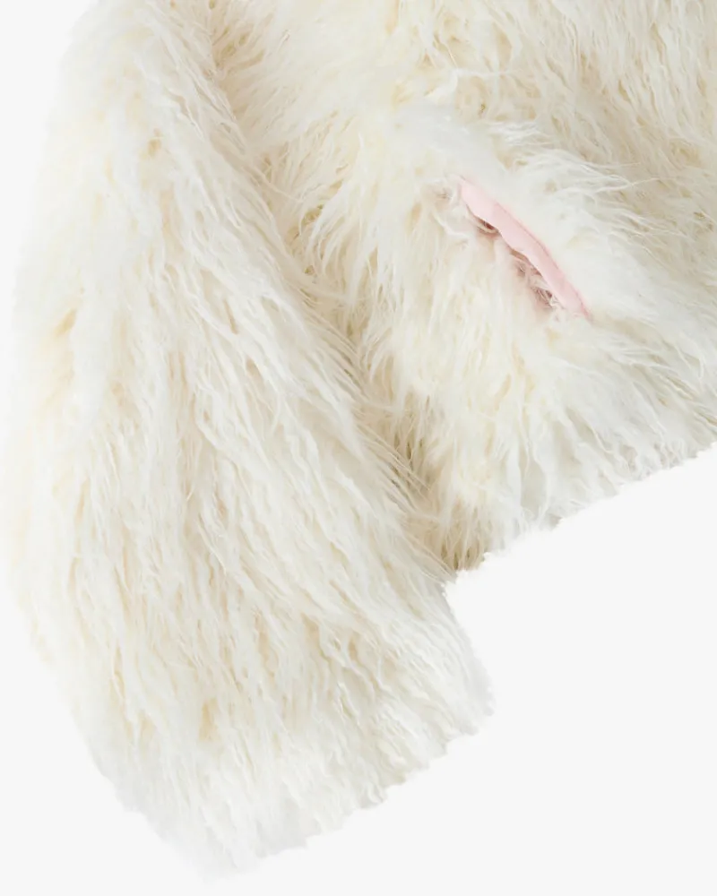 Fluffy faux fur zipper jacket with hood.