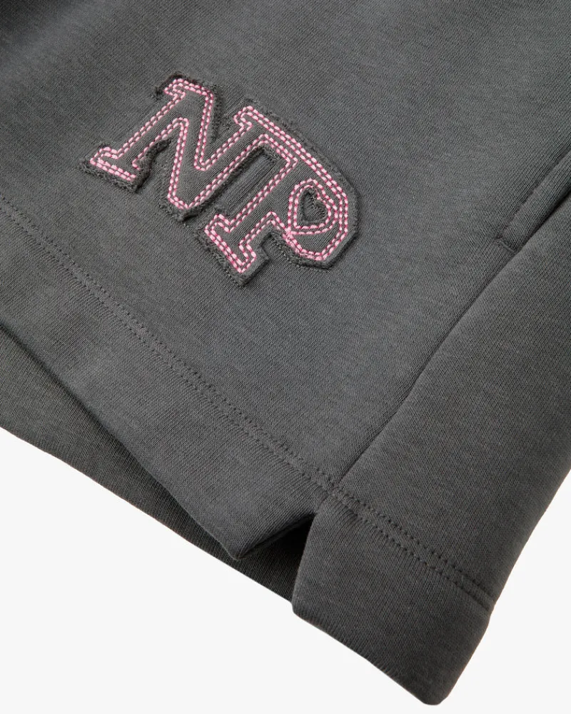 Logo “NP” applique with stitches.