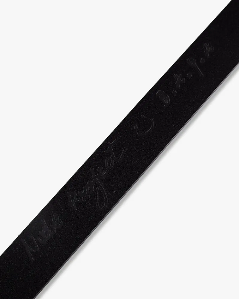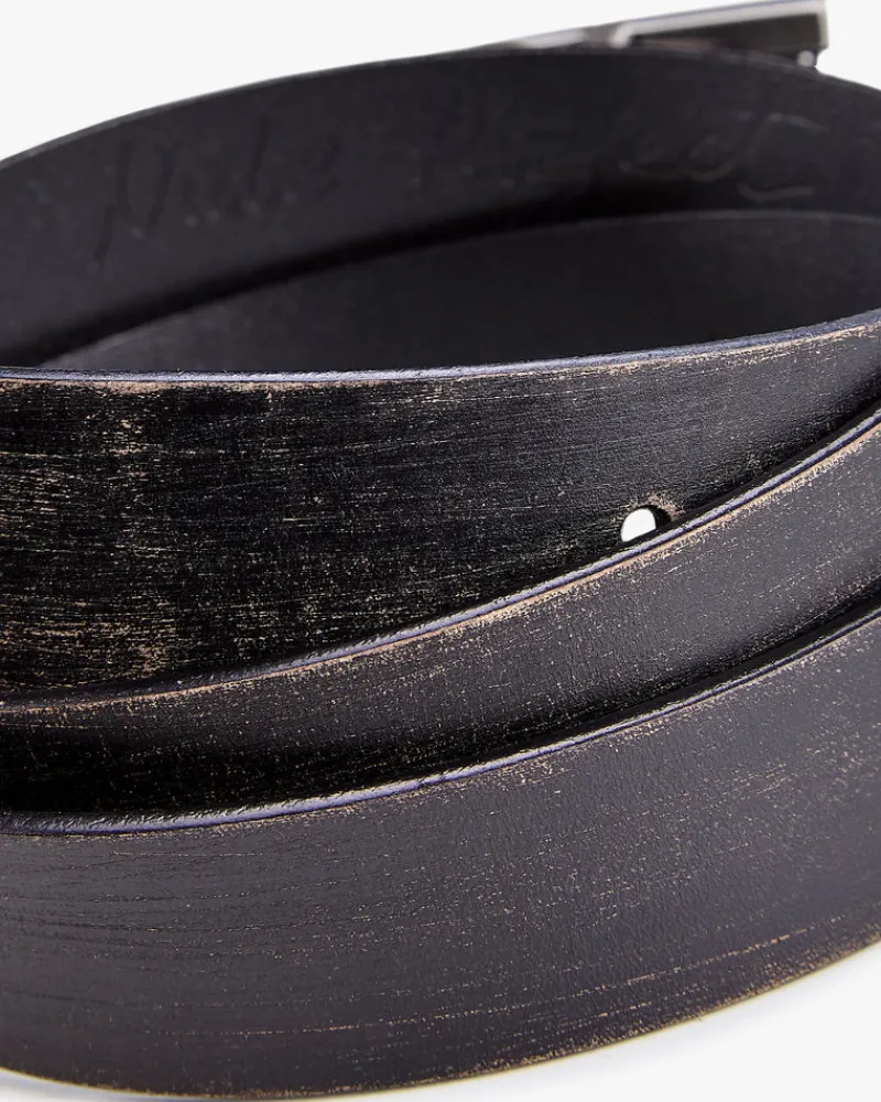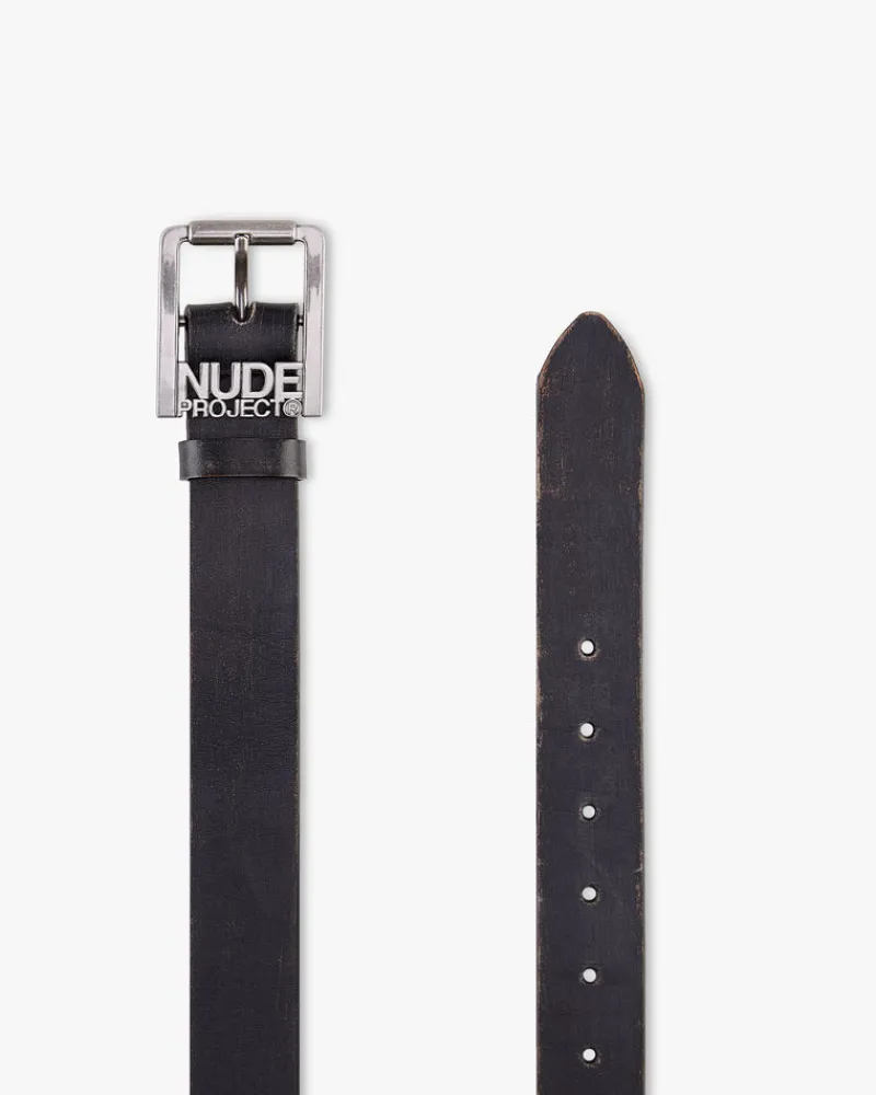 Front metal buckle featuring the Nude Project logo. The belt has a distressed effect throughout.