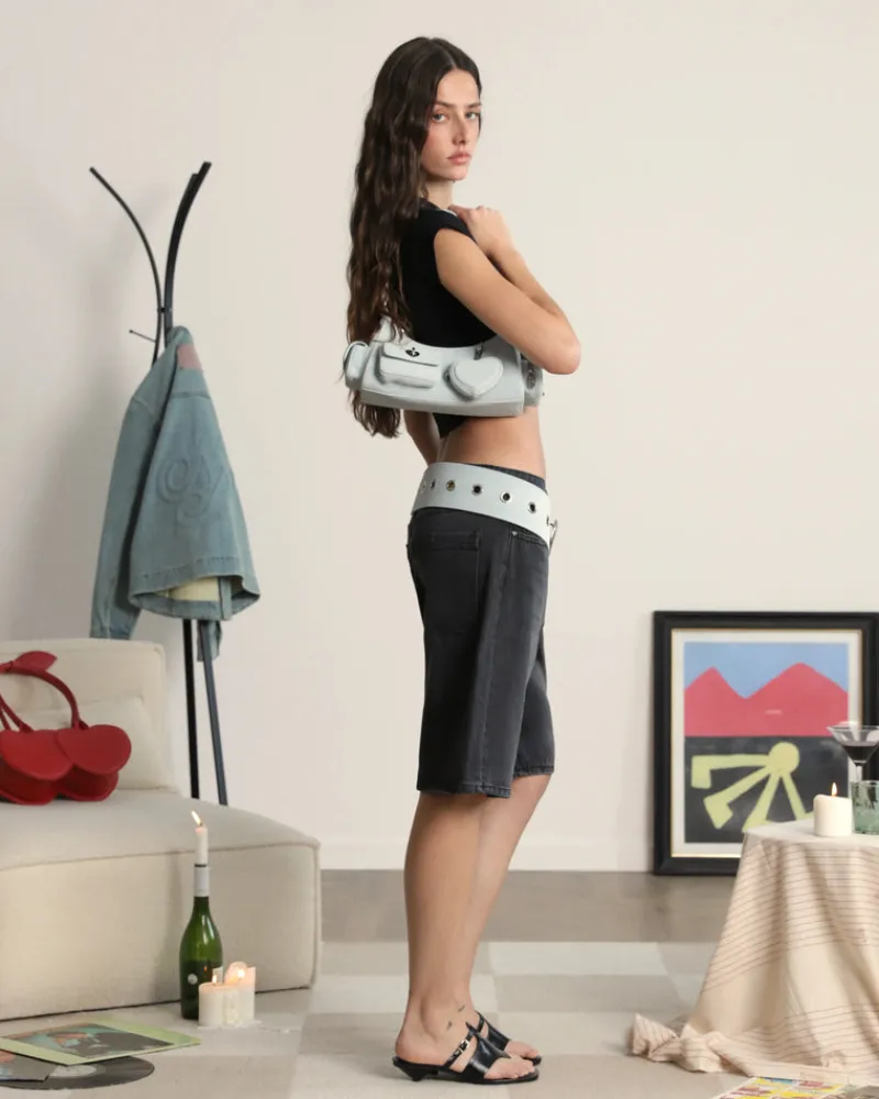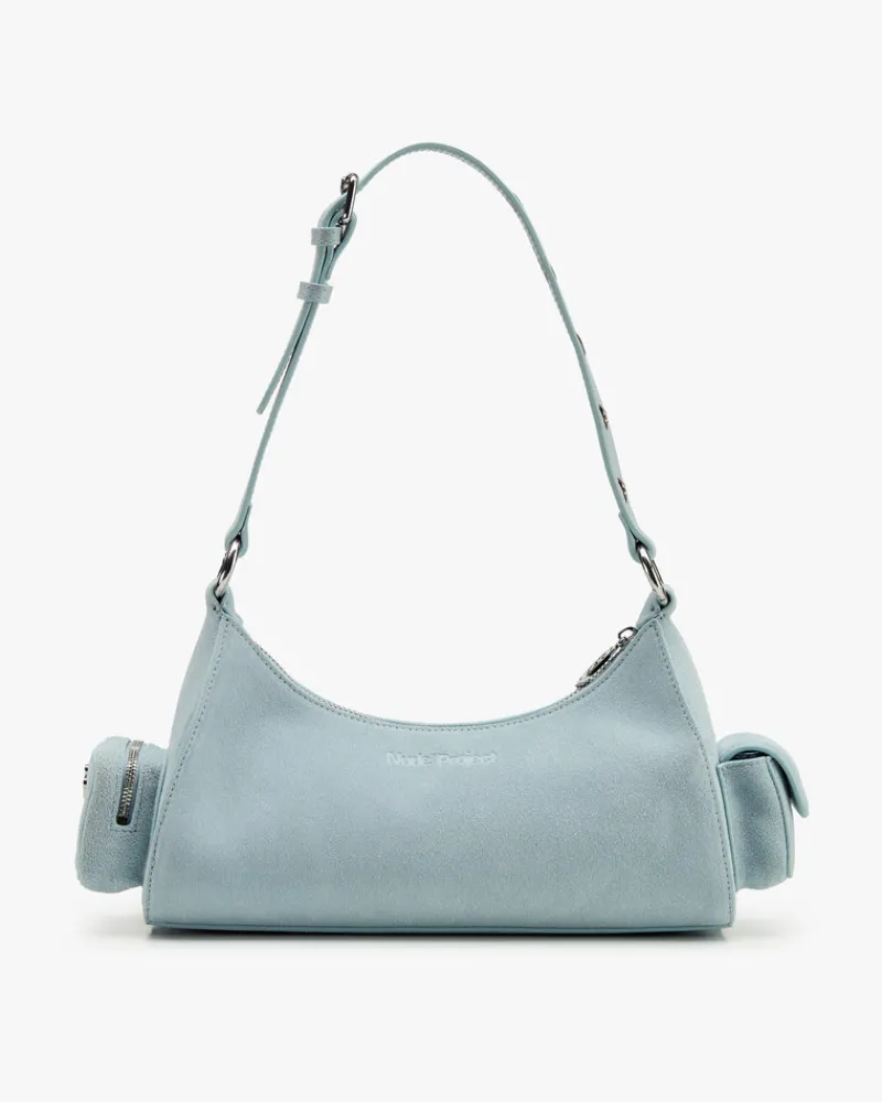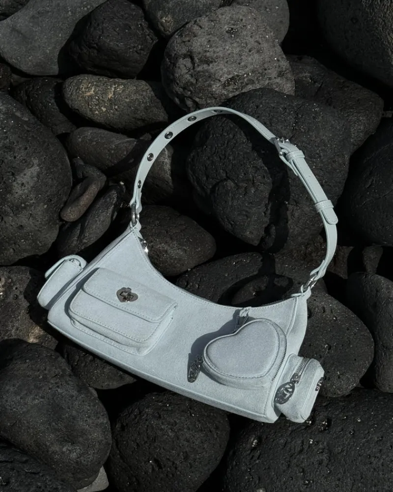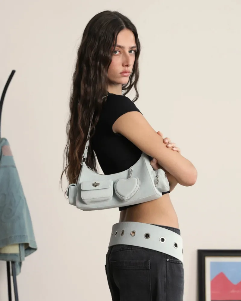Compact baguette style with multiple pockets for convenient storage. Includes a charming coin pouch in the shape of a heart.