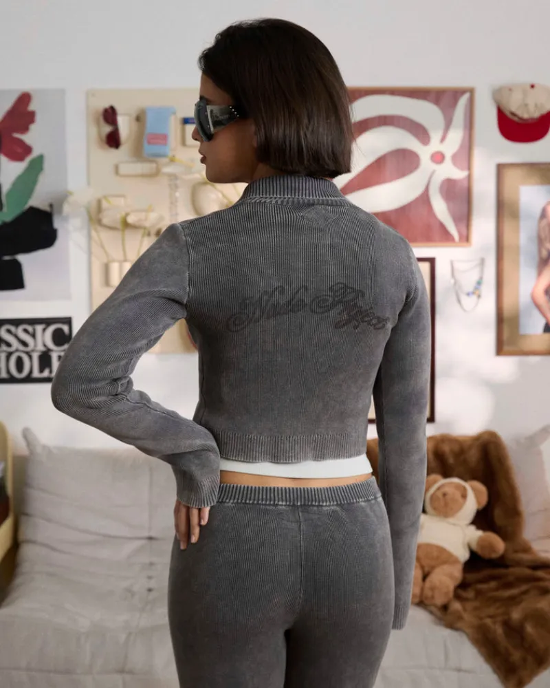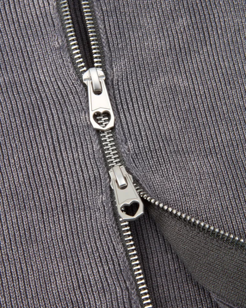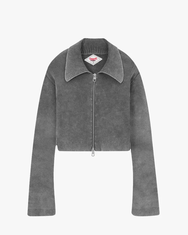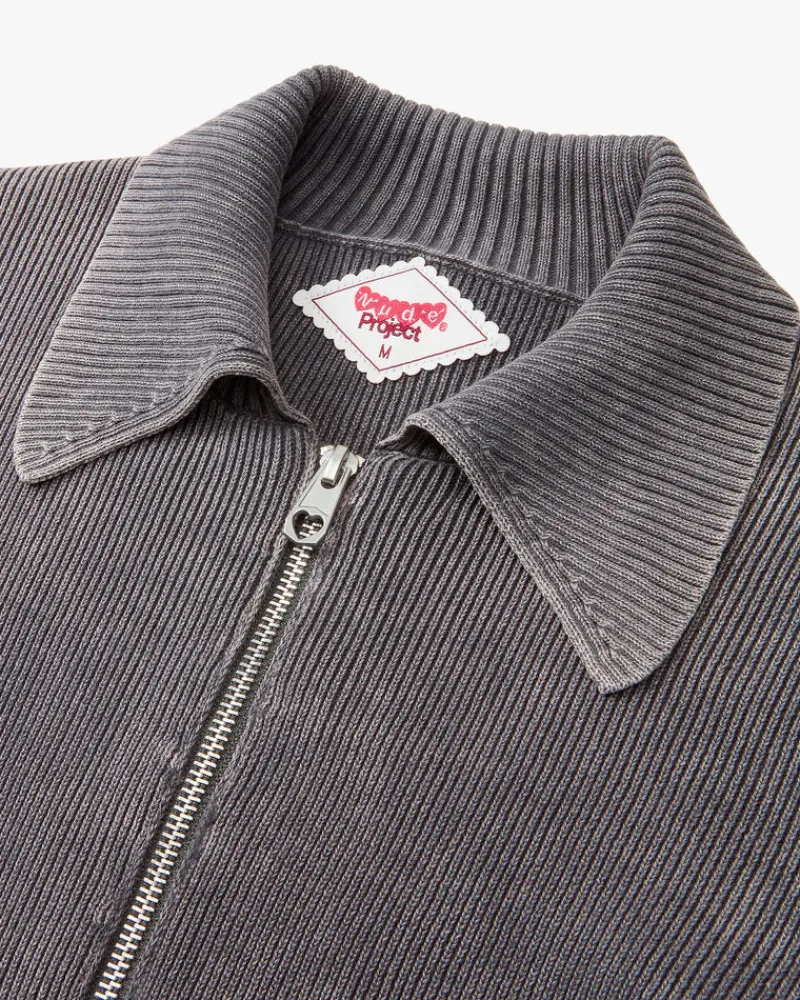 Knitted zipper with collar and custom puller. Yarn dye and hard wash.