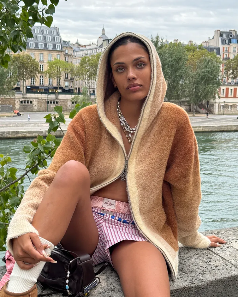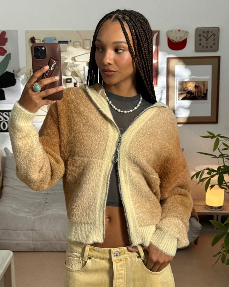 - Zipper knit hood with vertical degraded.