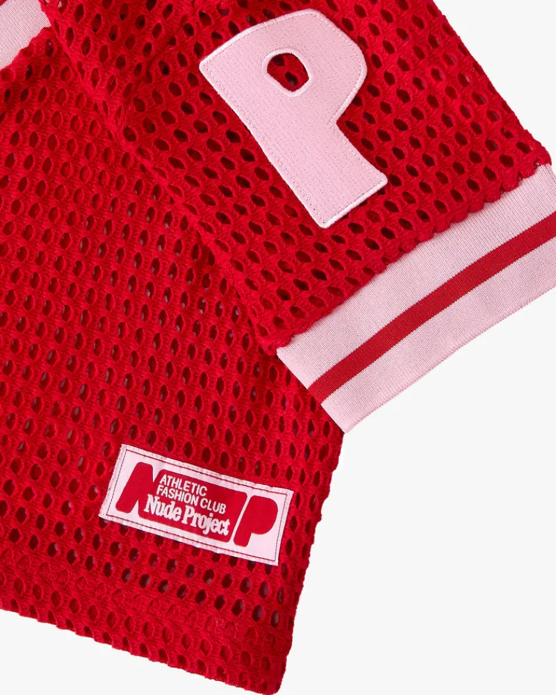 Wide hole mesh fabric. Elastic jacquard rib on neck and sleeves.