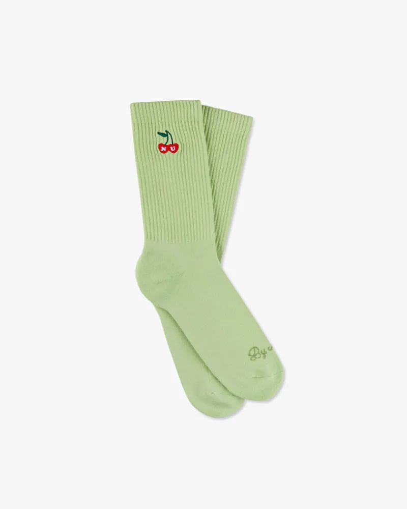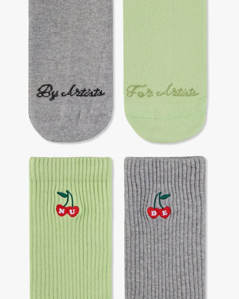 Two pairs – four colors. Minimalist cherry jacquard logo on the side with a quote embroidery on the front