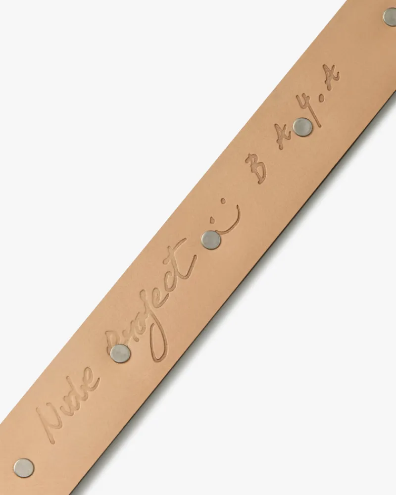 Metal studs with embossed “NP” logo along the strap, adding a bold yet refined detail. The hammered metal buckle enhances the textured aesthetic.